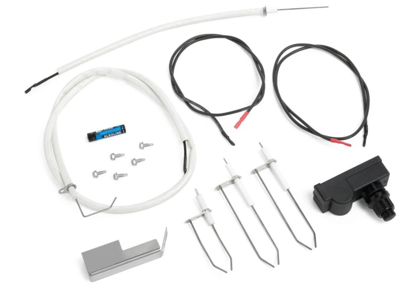 Replacement two spark igniter and electrode kit for Prestige® 308/450 models built after 2005. Includes one switch heat shield N585-0098, one LED wire harness N010-1052, one side burner electrode N240-0026, two electronic ignition leads N750-0016, one two-spark electronic ignition N357-0021, one AA battery, five screws.